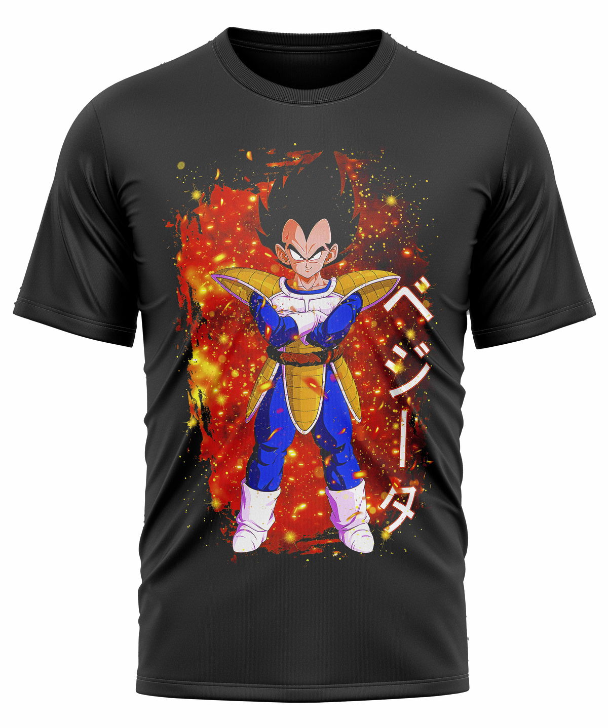 La remera muestra a Vegeta en su primera aparición en Dragon Ball Z, cuando llega a la Tierra junto a Nappa como antagonista.