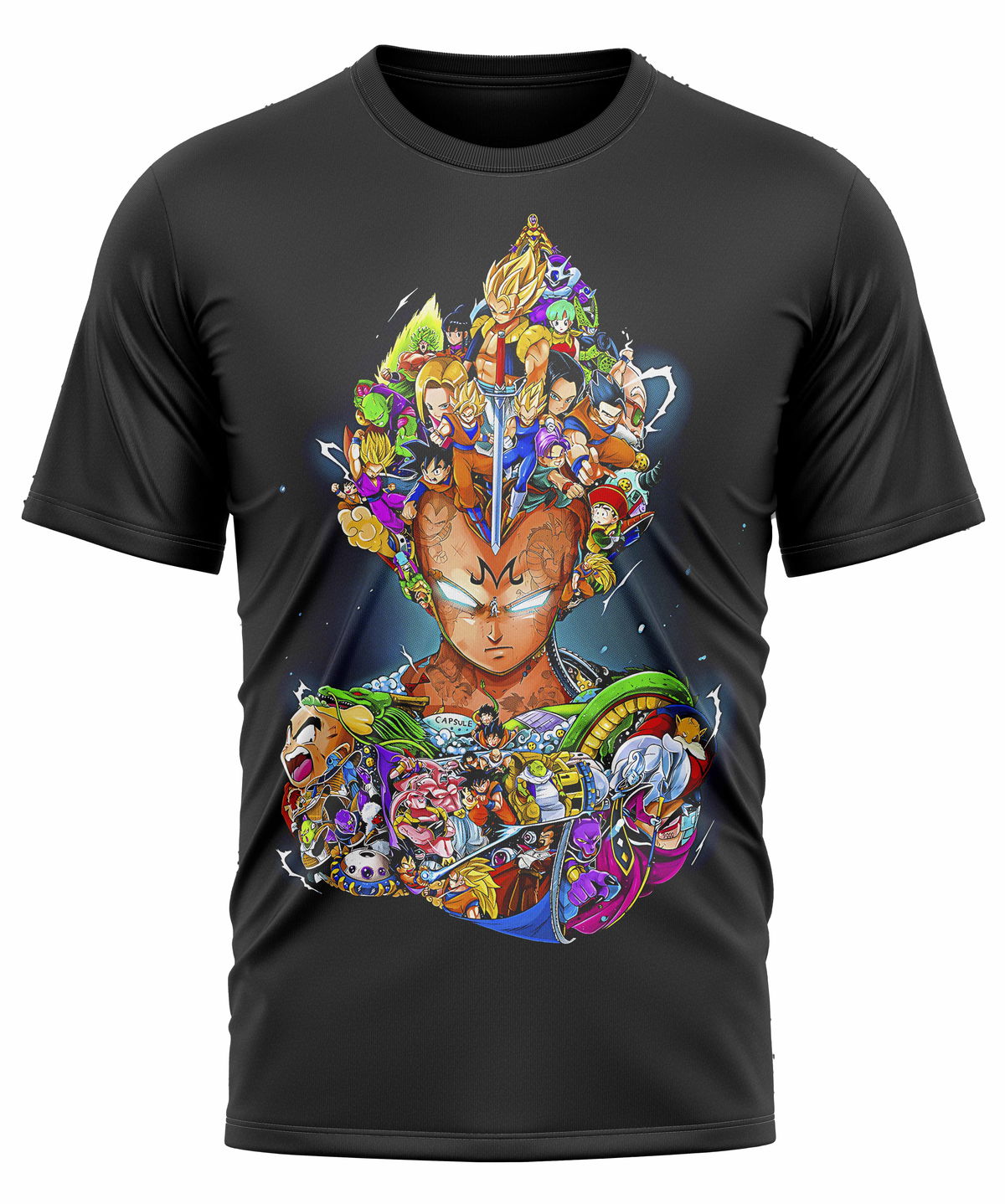 En el diseño de la remera, su cabello está compuesto por una espectacular collage de personajes del universo Dragon Ball, tanto héroes como villanos: Goku, Trunks, Piccolo, Freezer, Cell, Majin Buu, Gohan, Androides, y más. Es una composición que celebra toda la historia del anime, destacando la evolución del personaje y su lugar central en la saga.