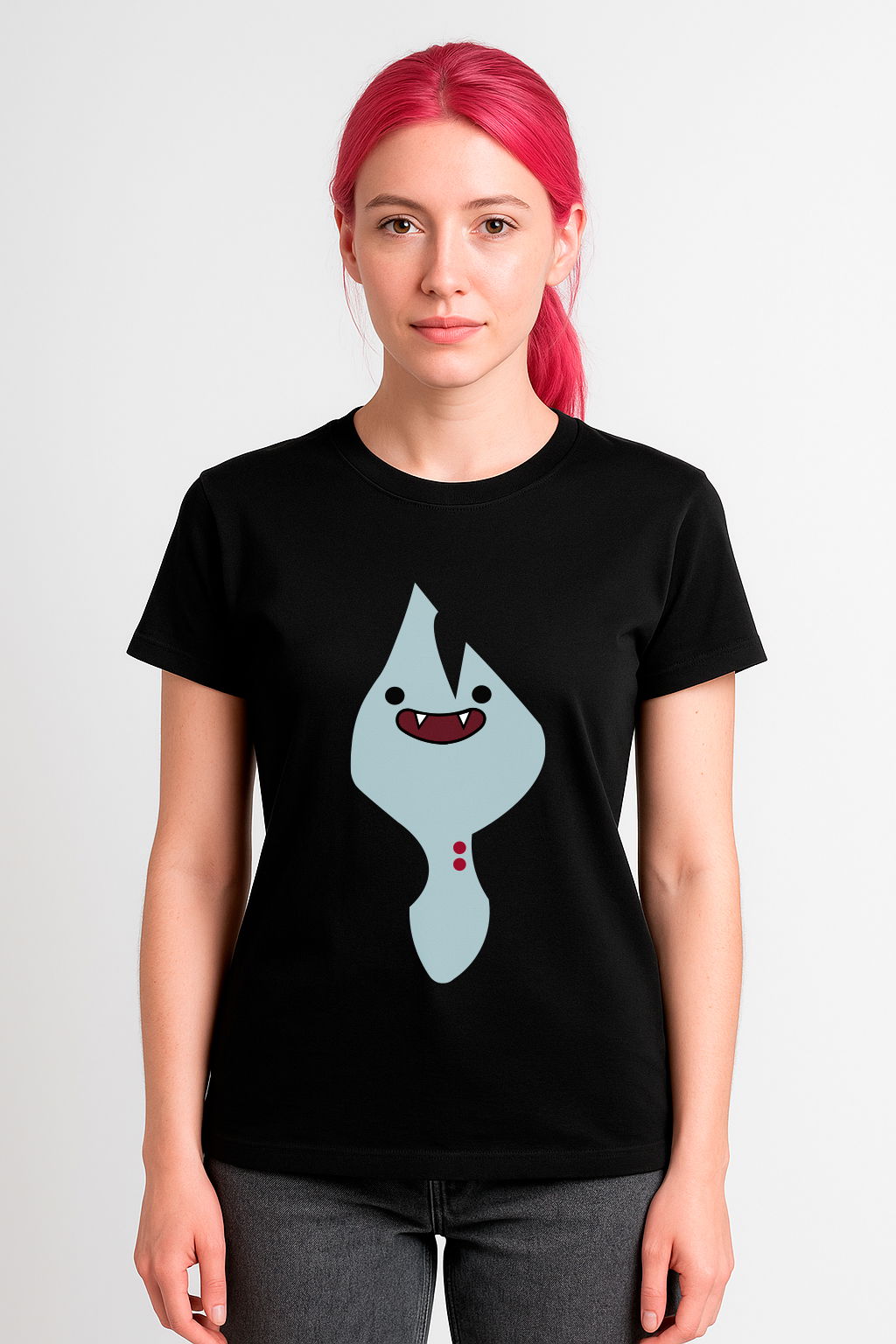 La remera que se ve en la imagen es negra y tiene estampado en el centro el personaje Marshall Lee en forma de fantasma/chibi al estilo Hora de Aventura.